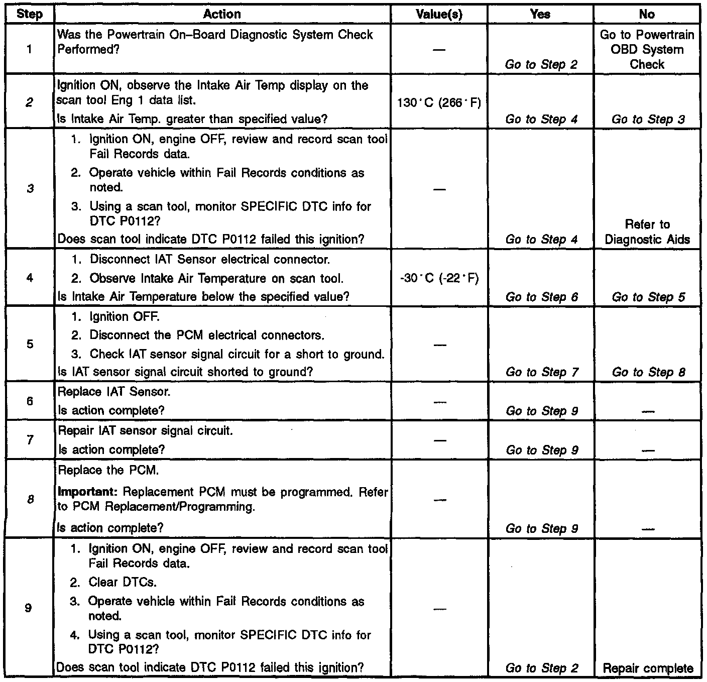 3. If DTC P0112 can be repeated only by duplicating the Fail Records conditions, refer to the Temperature vs. Resistance Value table. Specifications