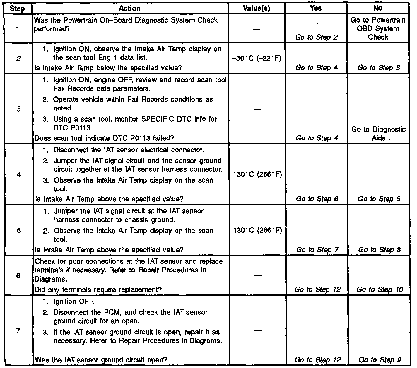 The table may be used to test the IAT sensor at various temperatures to evaluate the possibility of a 'shifted' sensor that may be open above or below a certain temperature. If this is the case, replace the IAT sensor. If the IAT sensor appears to be OK, the fault is intermittent; refer to Diagnostic Aids.
