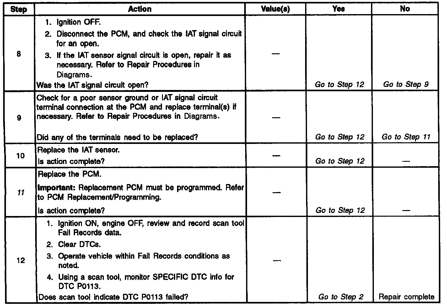 3. If DTC P0113 can be repeated only by duplicating the Fail Records conditions, refer to the Temperature Vs. Resistance Value table. Specifications