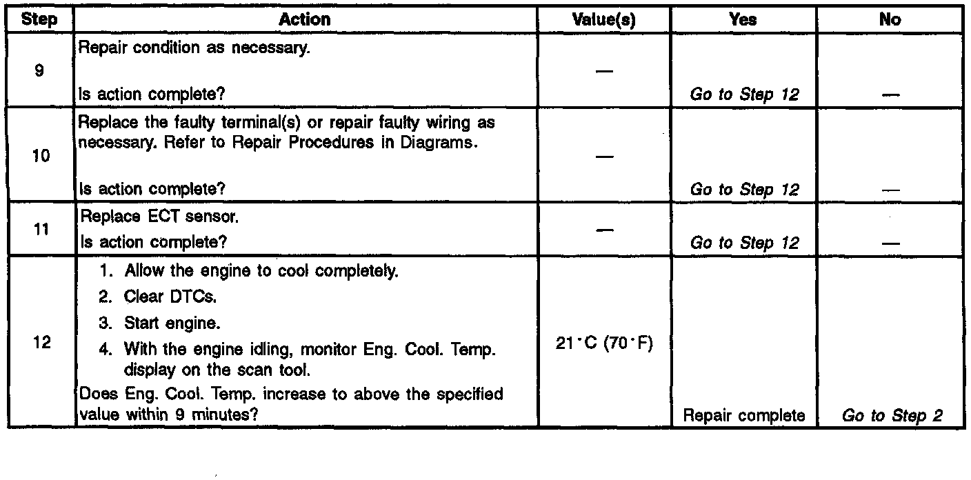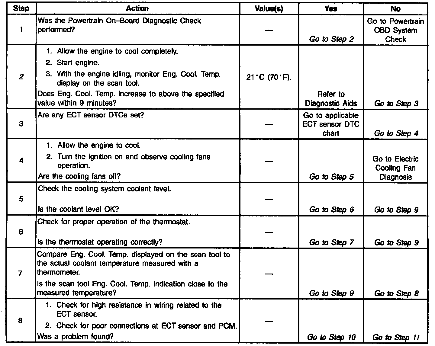2. Comparing the engine coolant temperature displayed on a scan tool with actual coolant temperature measured with a thermometer may isolate this condition. If the displayed engine coolant temperature is not close to the actual coolant temperature, replace the ECT sensor. If the temperatures are close, the fault is intermittent refer to Diagnostic Aids.