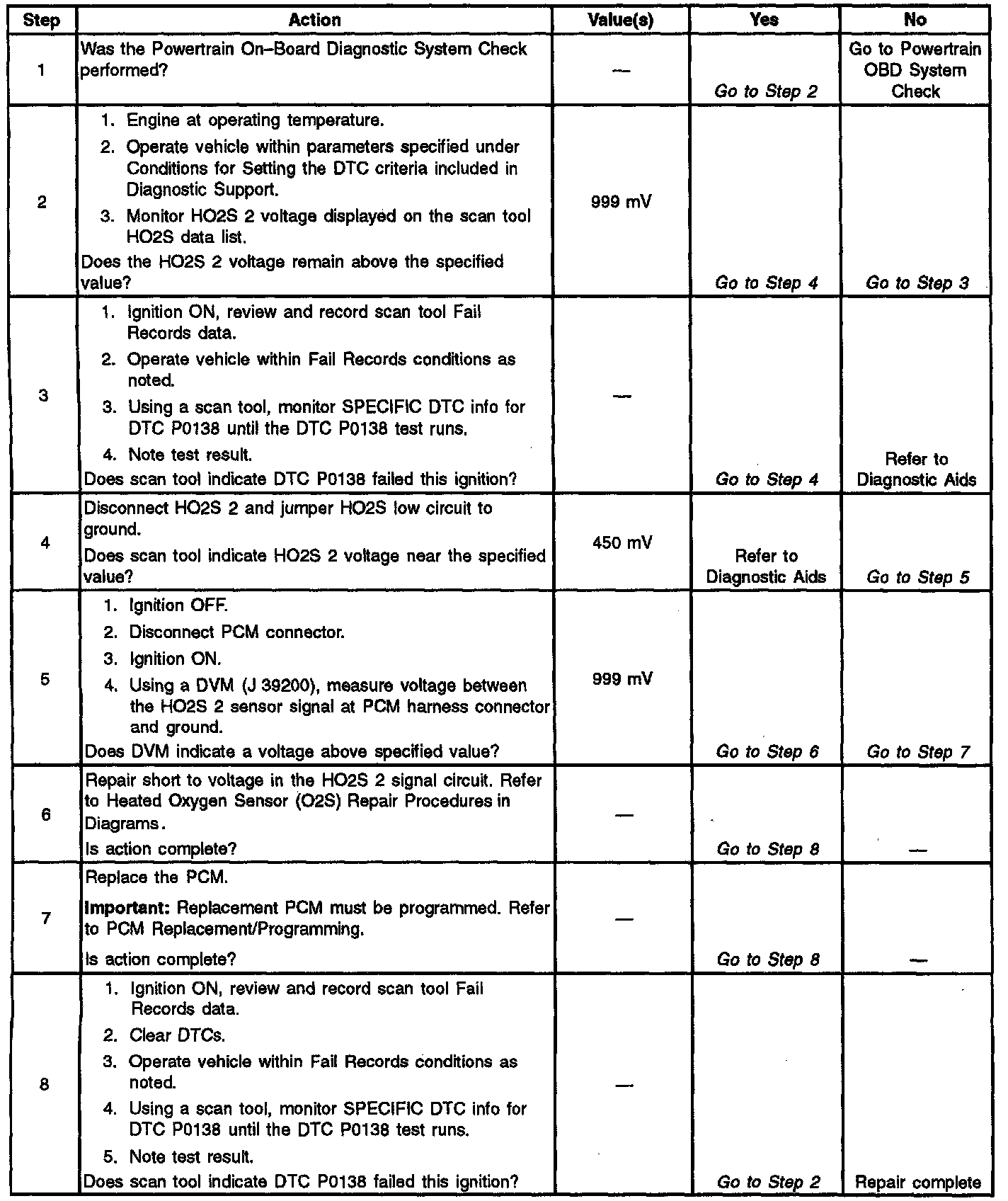 3. DTC P0138 being set during deceleration fuel mode operation may indicate a condition described in the Diagnostic Aids above. If the DTC P0138 test passes while the Fail Records conditions are being duplicated, an intermittent condition is indicated. Reviewing the Fail Records vehicle mileage since the diagnostic test last failed may help determine how often the condition that caused the DTC to be set occurs. This may assist in diagnosing the condition.