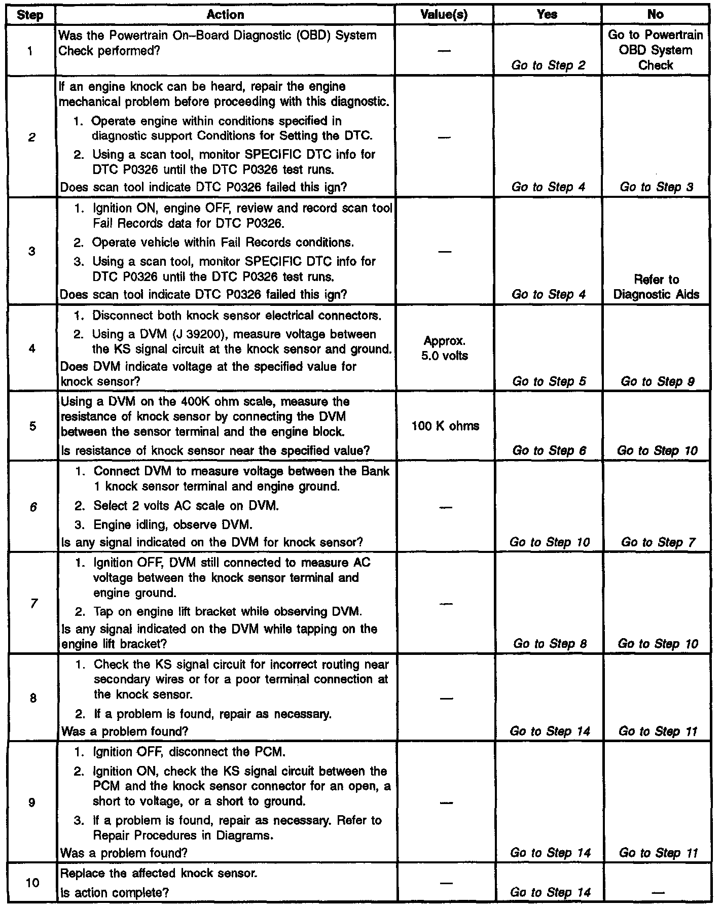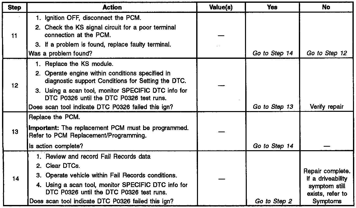 The PCM determines whether knock is occurring by comparing the signal level on the KS circuit with the voltage level on the noise channel. The noise channel allows the PCM to reject any false knock signal by indicating the amount of normal engine mechanical noise present. Normal engine noise varies depending on engine speed and load. When the PCM determines that an abnormally high noise channel voltage level is being experienced, a DTC P0326 will set.