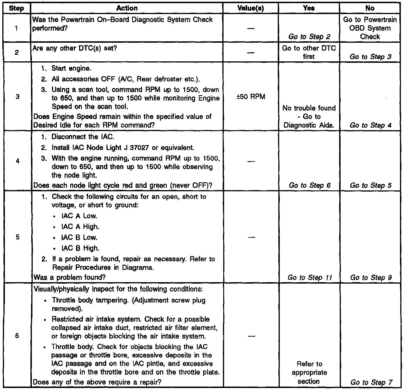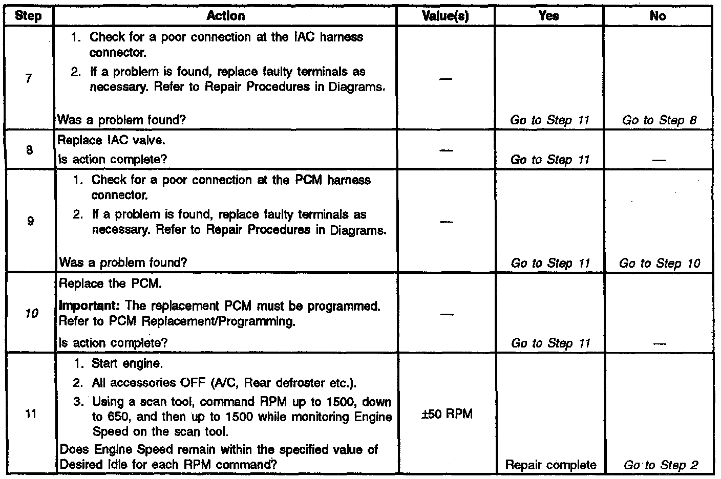 ^ Poor connection at PCM or IAC motor. Inspect harness connectors for backed out terminals, improper mating, broken locks, improperly formed or damaged terminals, and poor terminal to wire connection.