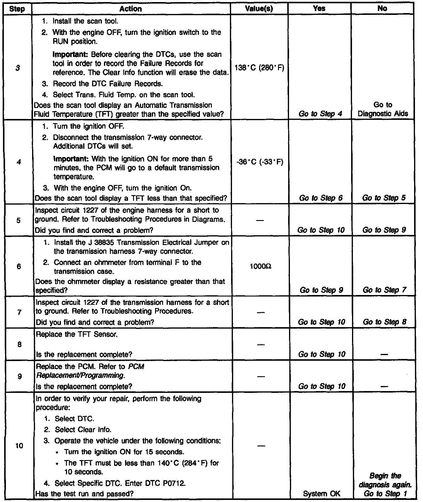 3. This step ensures that P0712 freeze frame or failure records have been recorded. A scan tool display of 138°C (280°F) or more indicates that this DTC is current.