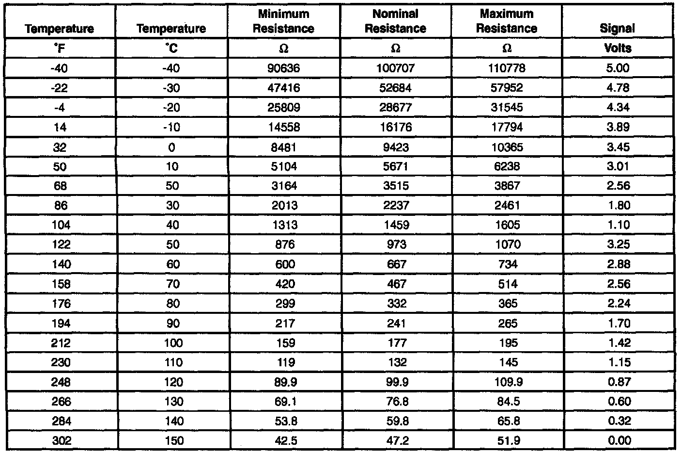 Temperature Vs. Resistance Chart: