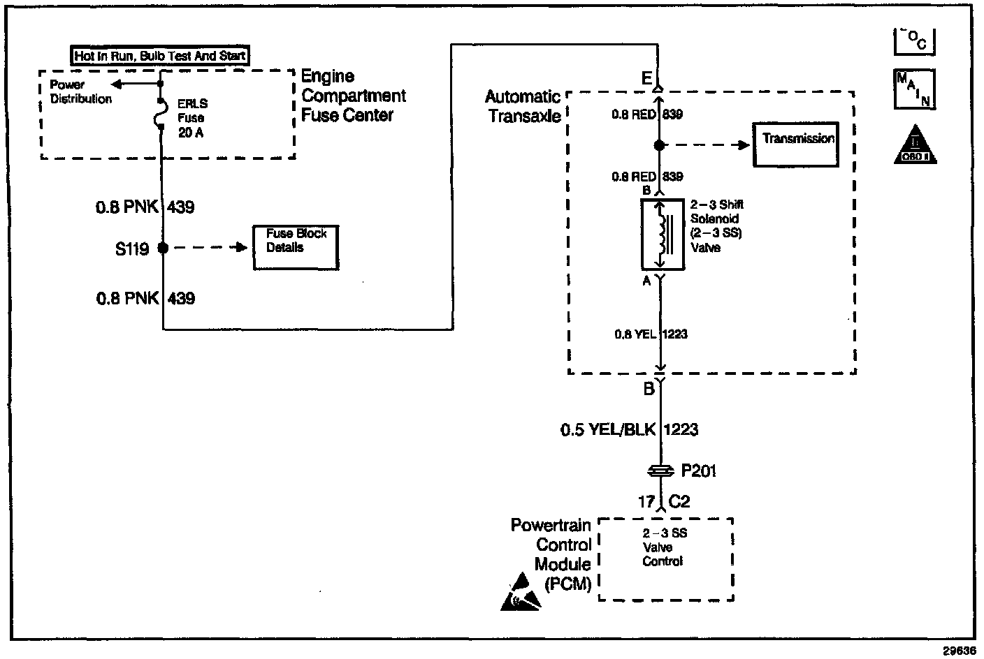 The 2-3 Shift Solenoid Valve (1-2 SS Valve) controls the transmission fluid pressure on the 2-3 shift valve. The ERLS fuse provides ignition voltage to the solenoid. The Output Driver Module (ODM), within the Powertrain Control Module (PCM), provides ground. The PCM monitors voltage levels at the ODM. When you command the 2-3 SS Valve ON. the PCM receives low voltage. When you command the 2-3 SS Valve OFF, the PCM receives high voltage.
