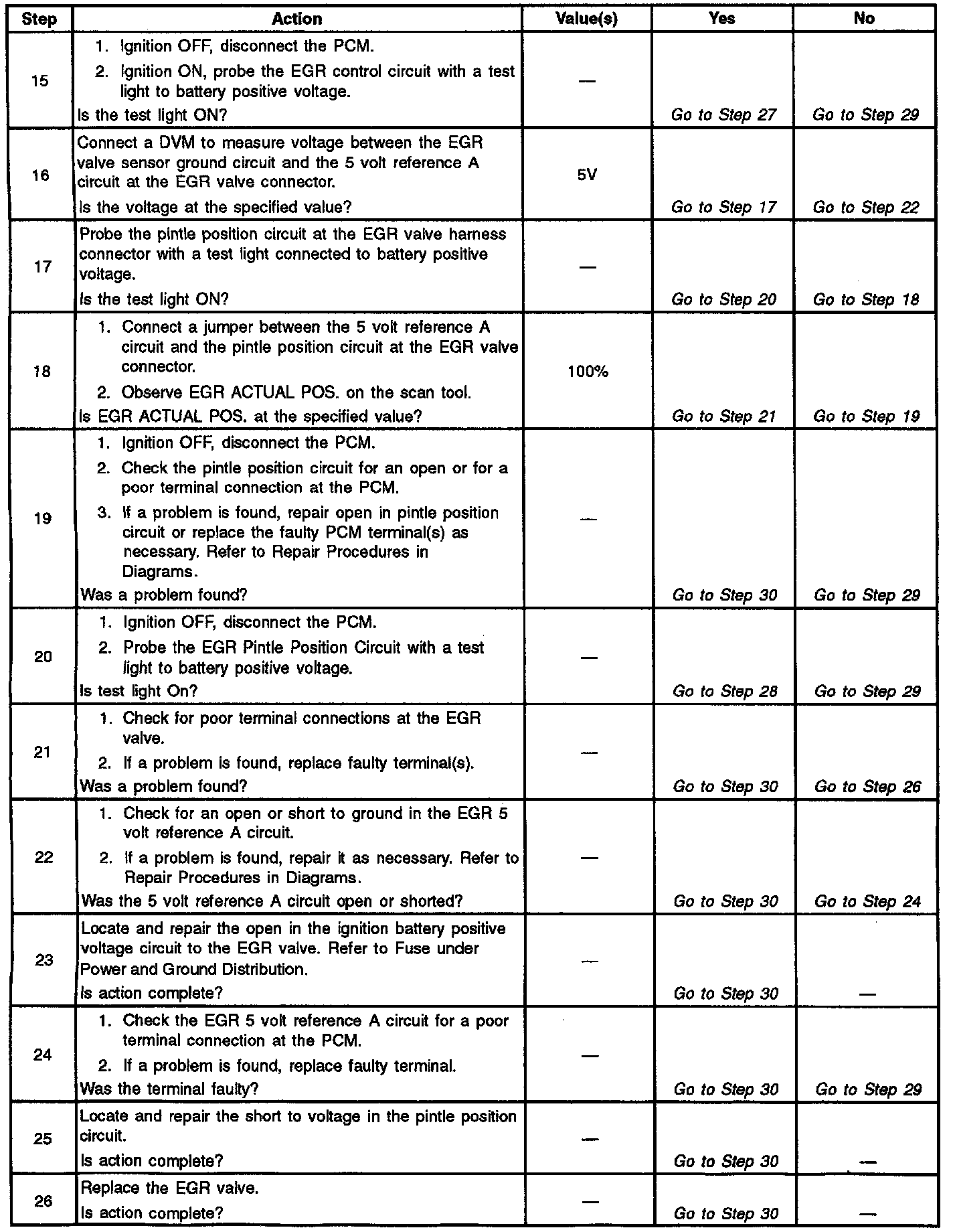 ^ Poor connection or damaged harness. Inspect the wiring harness for damage. If the harness appears to be OK, observe the EGR actual position display on the scan tool while moving connectors and wiring harnesses related to the EGR valve. A change in the display will indicate the location of the fault.