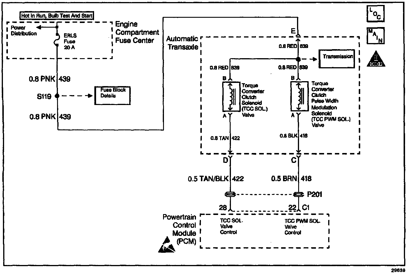 In conjunction with the Torque Converter Clutch Pulse Width Modulation Solenoid Valve (TCC PWM Sol. Valve), the Torque Converter Clutch Solenoid Valve (TCC Sol. Valve) controls the fluid acting on the TCC converter clutch valve. This controls the TCC apply and release. The PCM monitors the throttle position, the vehicle speed and other inputs in order to determine when to energize the TCC Sol. Valve. Circuit 439 supplies ignition voltage directly to the TCC Sol. Valve. The PCM controls the TCC Sol. Valve by providing the ground path through circuit 422. When you command the TCC Sol. Valve OFF, the PCM receives high voltage. When you command the TCC Sol. Valve ON, the PCM receives low voltage.