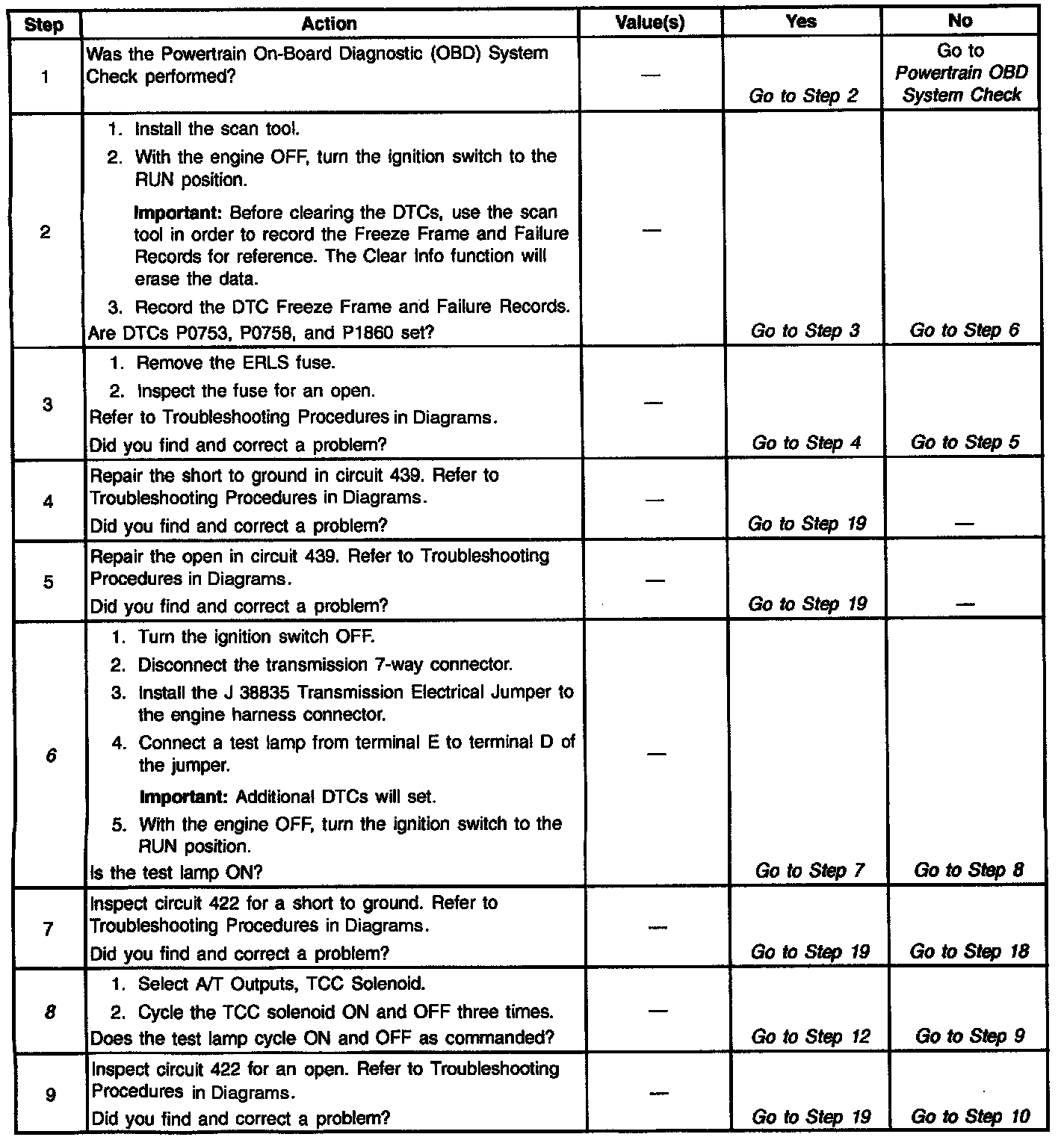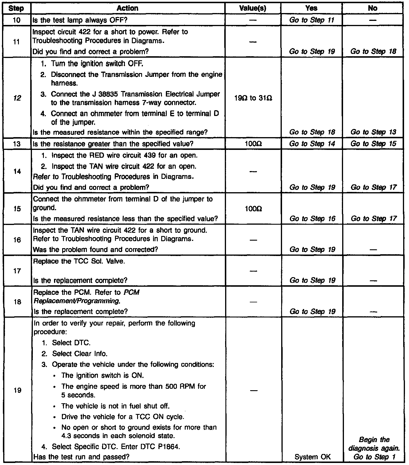 12. This Step verifies that the TCC Sol. Valve is not shorted across its windings or increased its resistance.