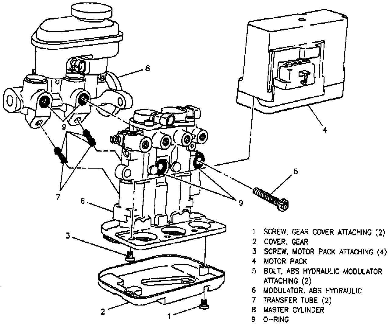 CAUTION: To help avoid personal injury, due to a retained load on the ABS hydraulic modulator, the gear tension relief function of the Tech 1 must be performed prior to removal of the ABS hydraulic modulator/master cylinder assembly. Refer to "Gear Tension Relief Sequence".