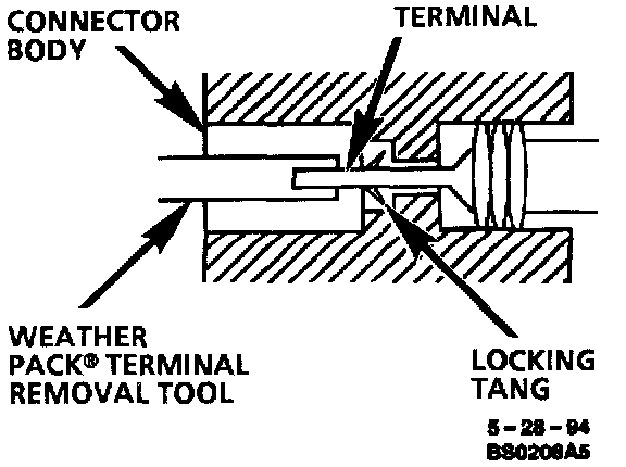 Insert the Weather Pack(R) terminal removal tool into the front (mating end) of the connector cavity until it rests on the cavity shoulder.