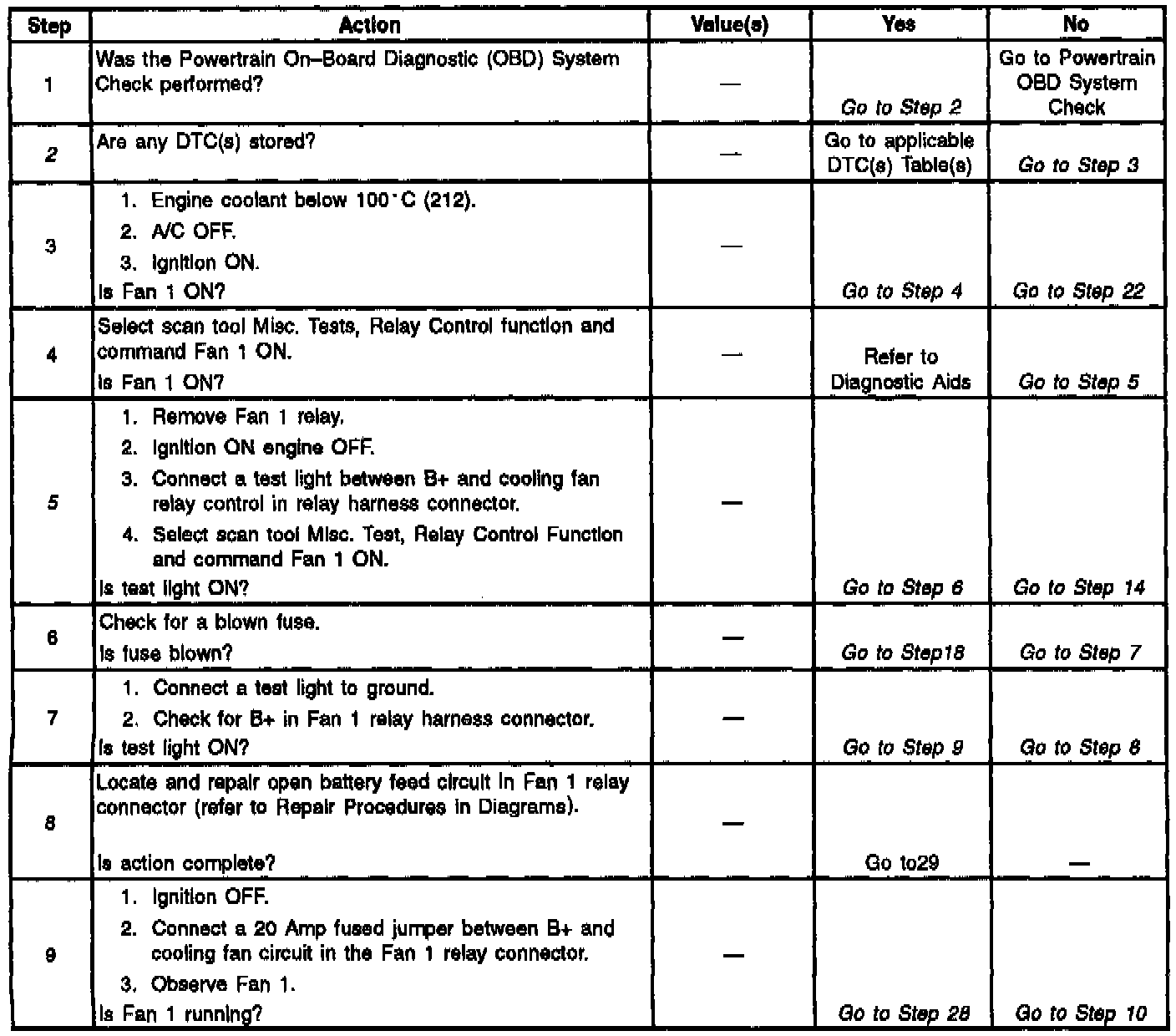 2. Stored Diagnostic Trouble Codes (That may not illuminate the Malfunction indicator Lamp) may enable the engine cooling fans. This Diagnostic Table may lead to improper diagnosis and replacement of good parts if Diagnostic Trouble Codes are present.