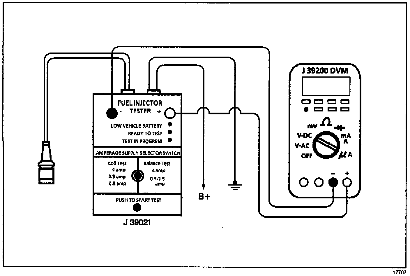 3. The first second of the voltage displayed by the Digital Volt Meter (DVM) may be inaccurate due to the initial current surge, therefore, record the lowest voltage displayed by the DVM after the first second of the test. The voltage displayed by the DVM should be within the specified range (refer to the Example). The voltage displayed by the DVM may increase throughout the test as the fuel injector windings warm and the resistance of the fuel injector windings changes. An erratic voltage reading (large fluctuations in voltage that do not stabilize) indicates an intermittent connection within the fuel injector.