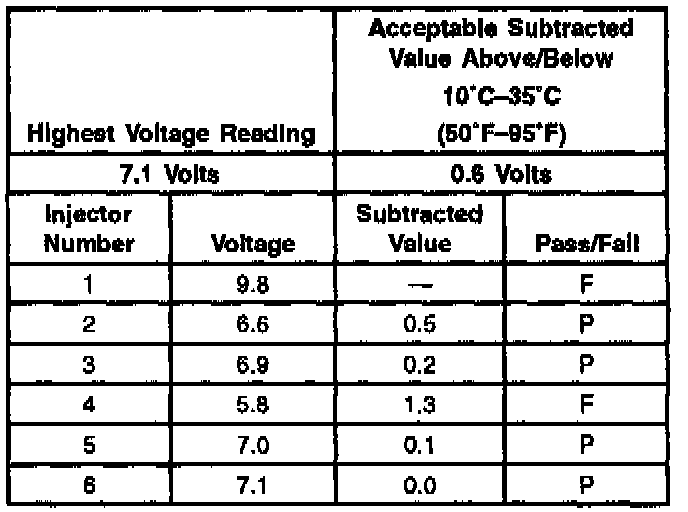 3. The first second of the voltage displayed by the Digital Volt Meter (DVM) may be inaccurate due to the initial current surge, therefore, record the lowest voltage displayed by the DVM after the first second of the test. The voltage displayed by the DVM may increase throughout the test as the fuel injector windings warm and the resistance of the fuel injector windings changes. An erratic voltage reading (large fluctuations in voltage that do not stabilize) indicates an intermittent connection within the fuel injector. From the voltages recorded, identify the highest voltage, excluding any voltages above 9.5 volts. Subtract each voltage that is not above 9.5 volts from the highest voltage. Record each subtracted value (refer to the Example). The subtracted value for any fuel injector must not exceed 0.6 volt. A fuel injector with a subtracted value that is greater than 0.7 volt is considered faulty and must be replaced. A fuel injector with a recorded voltage above 9.5 volts is also considered faulty and must be replaced.