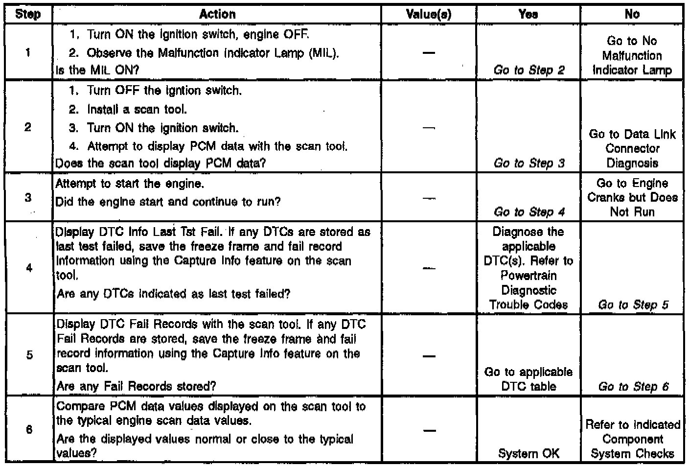 The Powertrain OBD system check is an organized approach to identifying a problem created by an electronic engine control system malfunction. The Powertrain OBD system check must be the starting point for any driveability complaint diagnosis. The Powertrain OBD system check directs the service technician to the next logical step in diagnosing a complaint. Do not perform this check if no driveability complaint exists. Understanding the table and using it correctly will reduce diagnostic time and prevent the replacement of good parts.