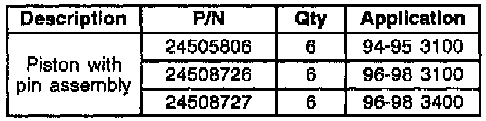 If piston-to-pin noise is detected and the customer desires the condition to be corrected, replace all six pistons with pin assemblies. The new piston sets have a minimal piston-to-pin clearance. Remember, piston-to-pin noise occurs in both park and drive at engine idle rpm and it varies in intensity depending on the number of pistons involved. A ticking sound means one piston is affected whereas a rattle or diesel type sound indicates more than one piston affected. The following should also be checked: