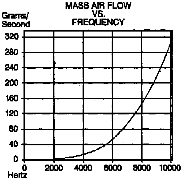 The MAF sensor used on this vehicle is a hot wire type and is used to measure air flow rate (mass/unit time). The MAF sensor output is a variable frequency square wave based on air mass traveling, through the sensor. A low frequency output signal from the MAF sensor indicates low air flow and high frequency indicates high air flow.