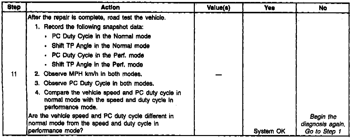 11. This Step road tests the vehicle. Record snapshot data from A/T 2 data list with the switch in the Normal, then the Performance positions. Observe the scan tool PC Duty Cycle, Shift TP Angle, MPH, and Commanded Gear. In both the normal and the performance mode, do not vary the TP shift angle by more than 2%. Compare the performance and normal modes. The PC duty cycle should be lower, and the vehicle speed should be higher in the performance mode.