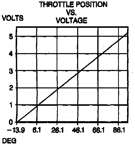 The PCM provides a 5 volt reference signal and a ground to the TP sensor and the sensor returns a signal voltage that changes with throttle valve angle. At closed throttle (close to 0°) the TP sensor output signal is low (below 1 volt) and at WOT (greater than 80°) the TP sensor output signal is high (above 4 volts). Because the TP sensor is not adjustable, the PCM must account for build tolerances that could affect the TP sensor output at closed throttle. The PCM uses a learning process so that it can correct for variations of up to 6° of throttle angle. The PCM uses TP information to modify fuel control based on throttle valve angle. For example, power enrichment occurs when the throttle angle approaches WOT. Acceleration enrichment occurs when the throttle angle increases rapidly (similar to an accelerator pump on a carburetor). A faulty TP sensor may cause various driveability conditions and should set a DTC.