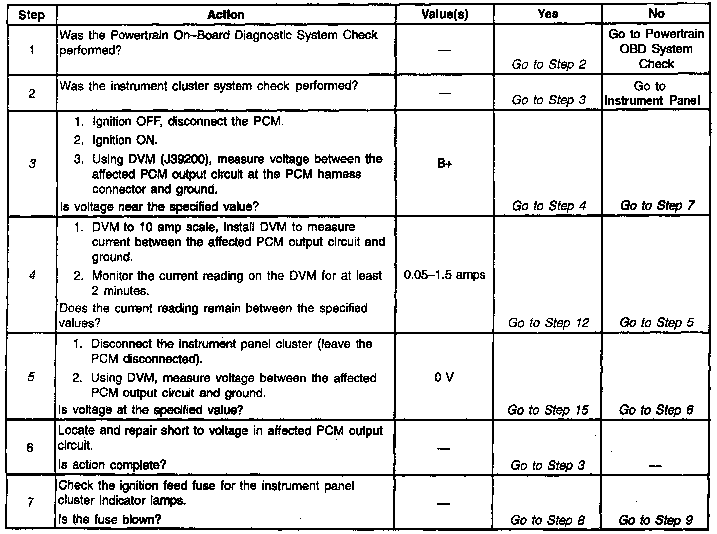 4. Checks for a shorted component or a short to B+ on the output driver circuit. Either condition would result in a measured current of over 1.5 amps. Also checks for a component that is going open while being operated, resulting in a measured current of 0 amps.