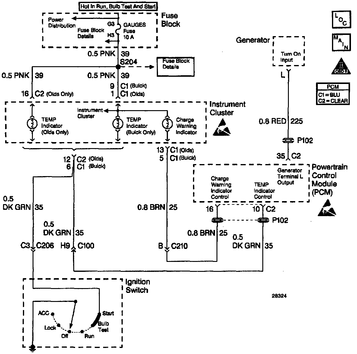 The PCM turns ON the bulb, LED, or driver info center indicator by supplying a path to ground through the PCM.