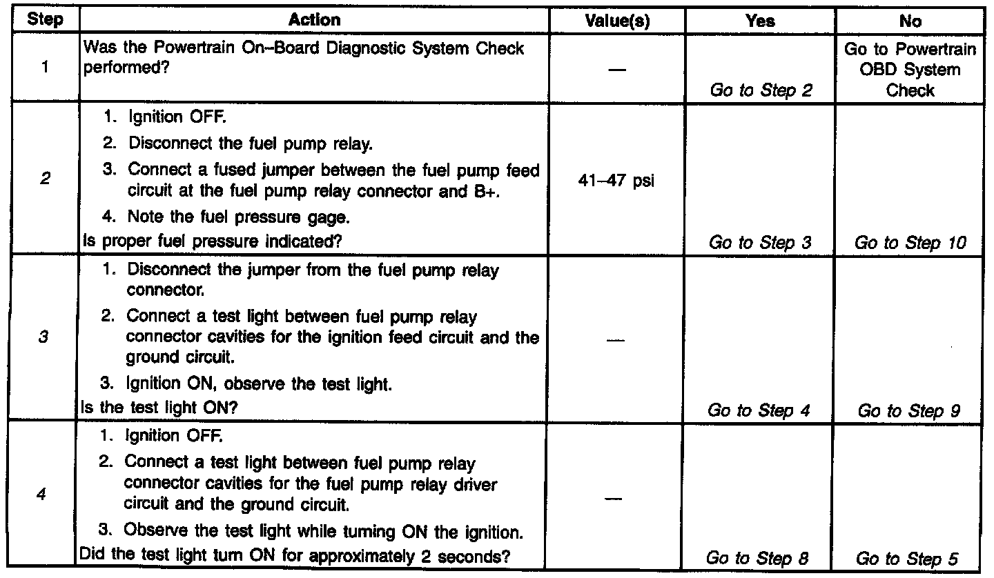 10. If the fuel pump is operating but incorrect pressure is noted, the fuel pump wiring is OK and Fuel System Pressure Test should be used for diagnosis.