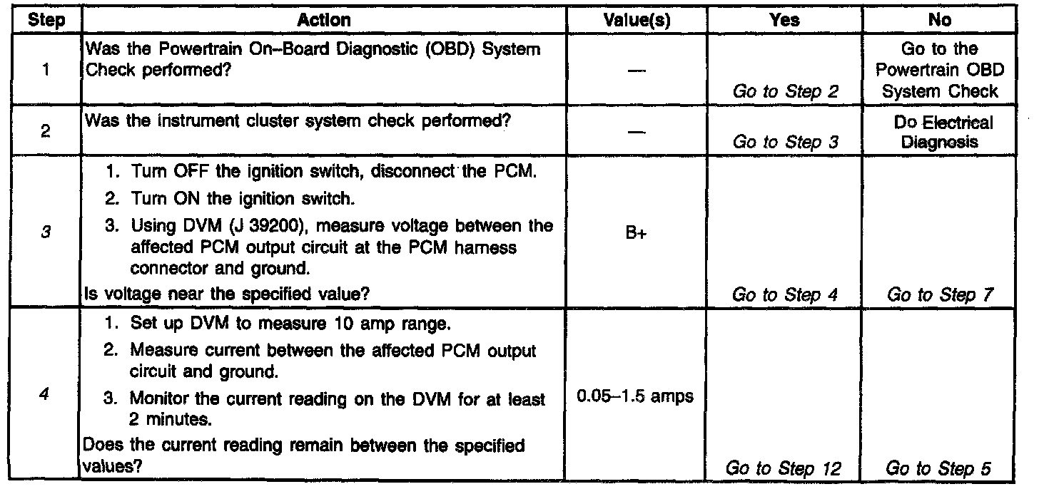 4. Checks for a shorted component or a short to B+ on the output driver circuit. Either condition would result in a measured current of over 1.5 amps. Also checks for a component that is going open while being operated, resulting in a measured current of 0 amps.