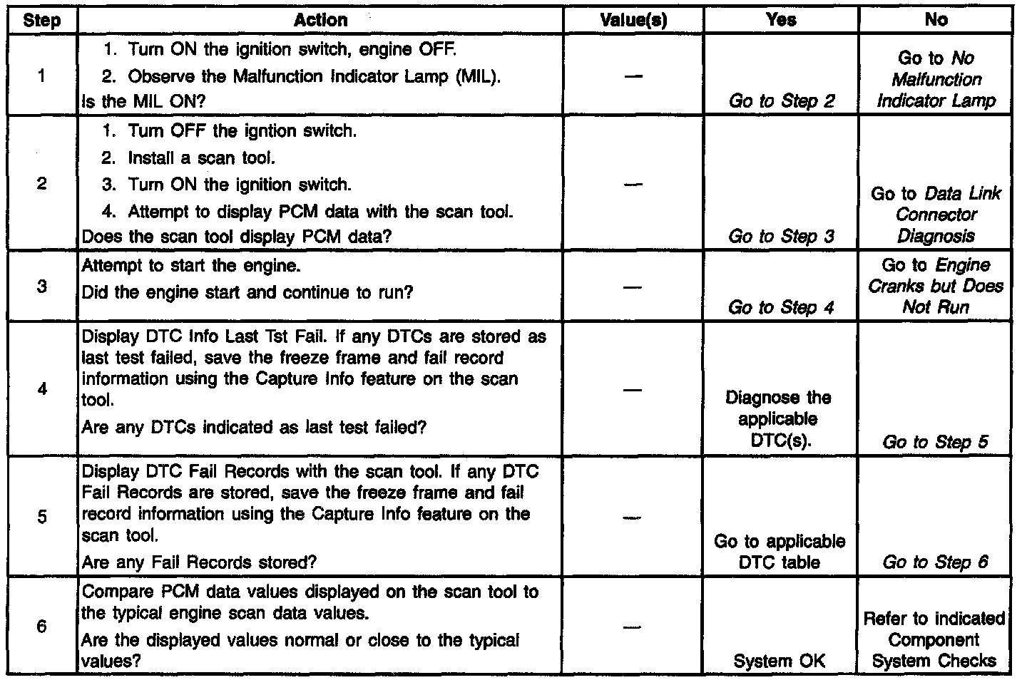 The Powertrain On-Board Diagnostics (OBD) system check is an organized approach to identifying a problem created by an electronic engine control system malfunction. The Powertrain OBD system check must be the starting point for any driveability complaint diagnosis. The Powertrain OBD system check directs the service technician to the next logical step in diagnosing a complaint. Do not perform this check if no driveablity complaint exists. Understanding the table and using it correctly will reduce diagnostic time and prevent the replacement of good parts.
