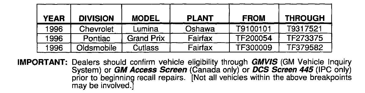 Involved are all 1996 Chevrolet Lumina, Pontiac Grand Prix and Oldsmobile Cutlass model vehicles equipped with 3.4L DOHC V6 (RPO LQ1 - VIN Code X) engine and built within these VIN breakpoints shown.