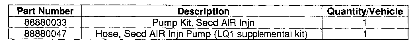 Parts required to complete this recall are to be obtained from General Motors Service Parts Operations (GMSPO). Please refer to your "involved vehicles listing" prior to ordering requirements. Normal orders should be placed on a DRO = Daily Replenishment Order. An emergency requirement should be ordered on a OSO = Customer Special Order. It is necessary to order both kits for each AIR pump installation.