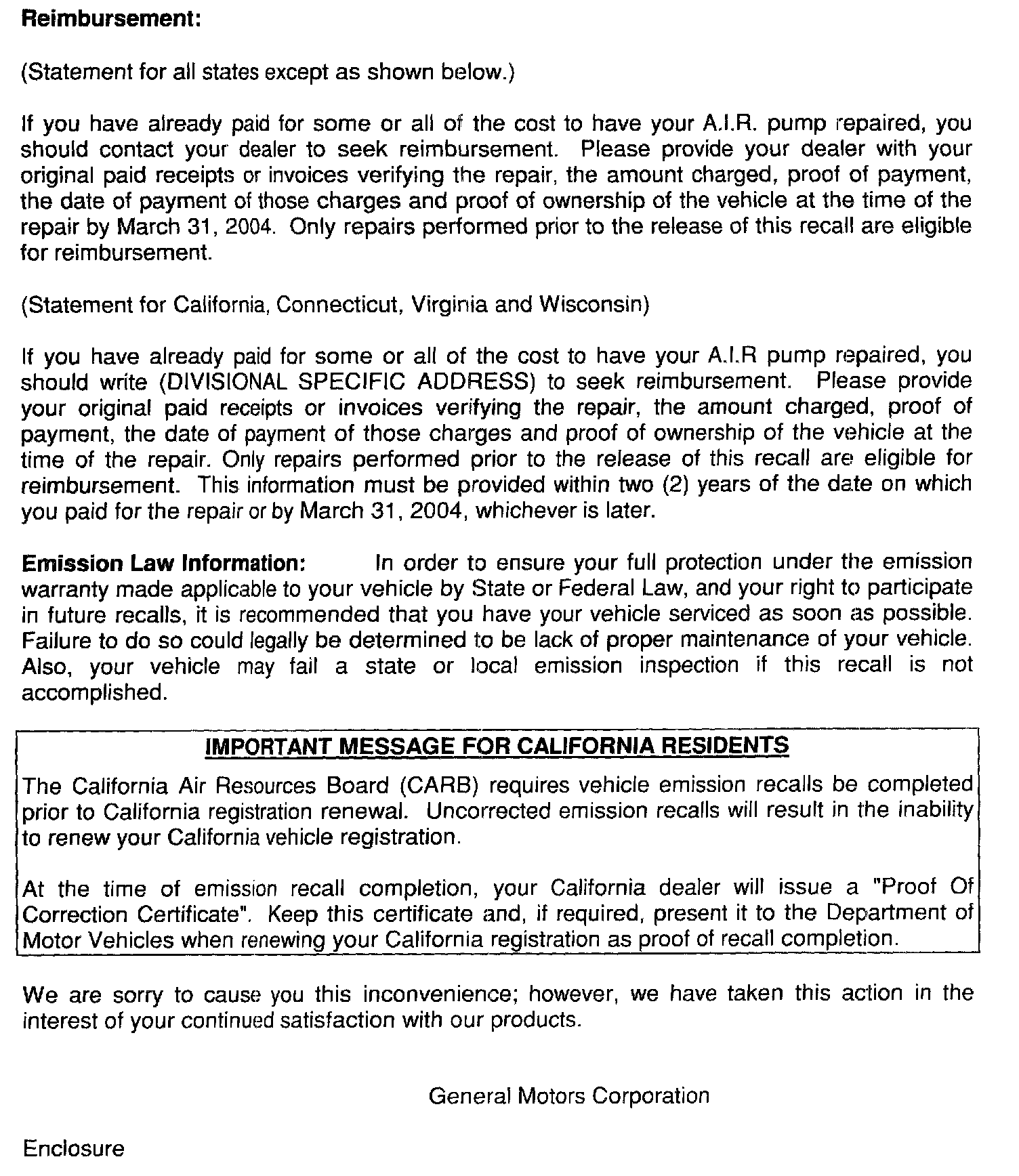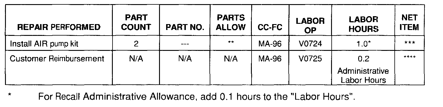 Customer requests for reimbursement of previously paid repairs to correct the A.I.R. pump system are to be submitted prior to or by March 31, 2004 (this time limitation may be longer depending upon the law in your state/province/country).