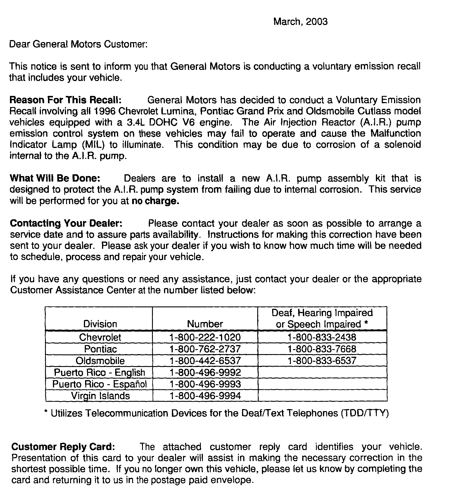 Customers will be notified of this recall on their vehicles by General Motors (see copy of customer letter included with this bulletin).