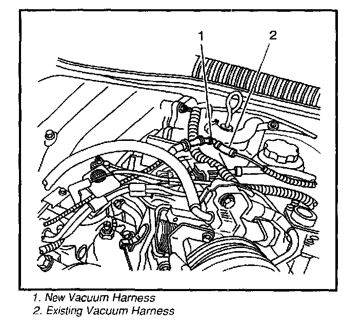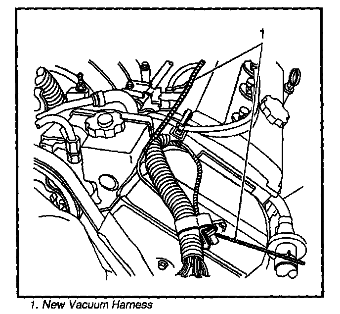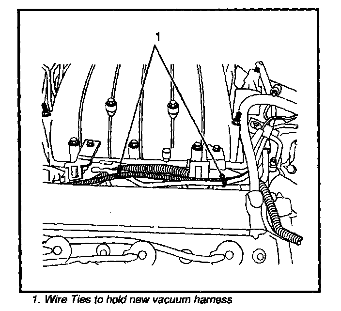 2. Remove the fuel rail sight shield and disconnect the HVAC vacuum connector to the intake manifold. Route the new vacuum harness on the top of the engine forward of the fuel rail, and connect the 1/4" fitting to the intake manifold port and connect the HVAC hose to the open fitting on the new harness. Add wire ties as shown to secure new vacuum line.