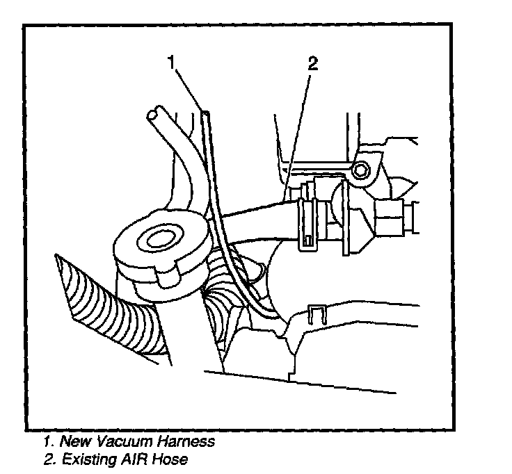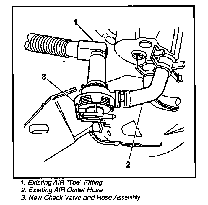 26. Using the tie strap (2), support the vacuum harness and AIR pump inlet (3) (near the splash cap) to the front bank check valve hose.