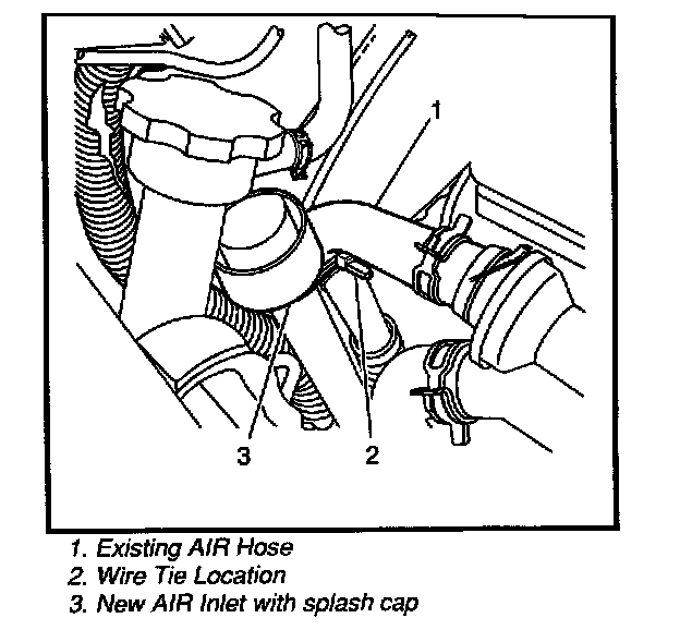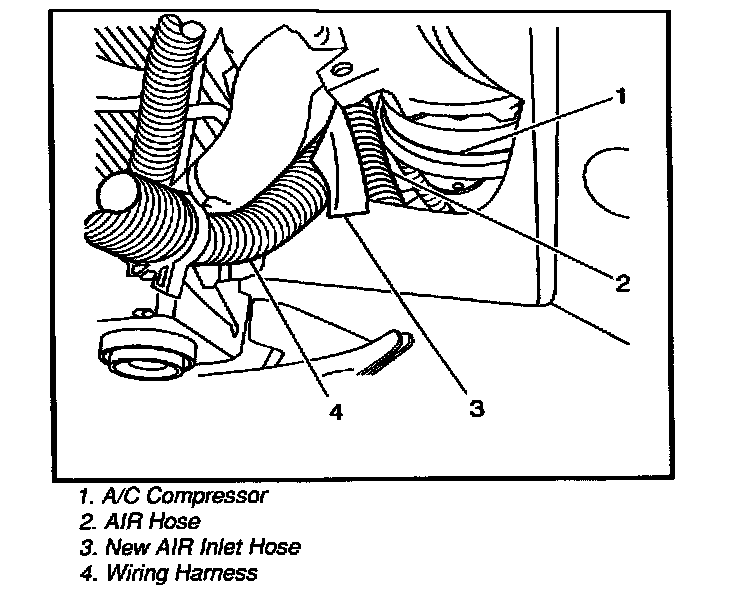 22. Attach the "S" shaped end of the new inlet hose to the filter (using the same clamp removed earlier) and route the hose into the engine compartment through the gap between the inner fender and the frame forward of the AIR hose to the front bank check valve and rearward of the wiring harness bundle.
