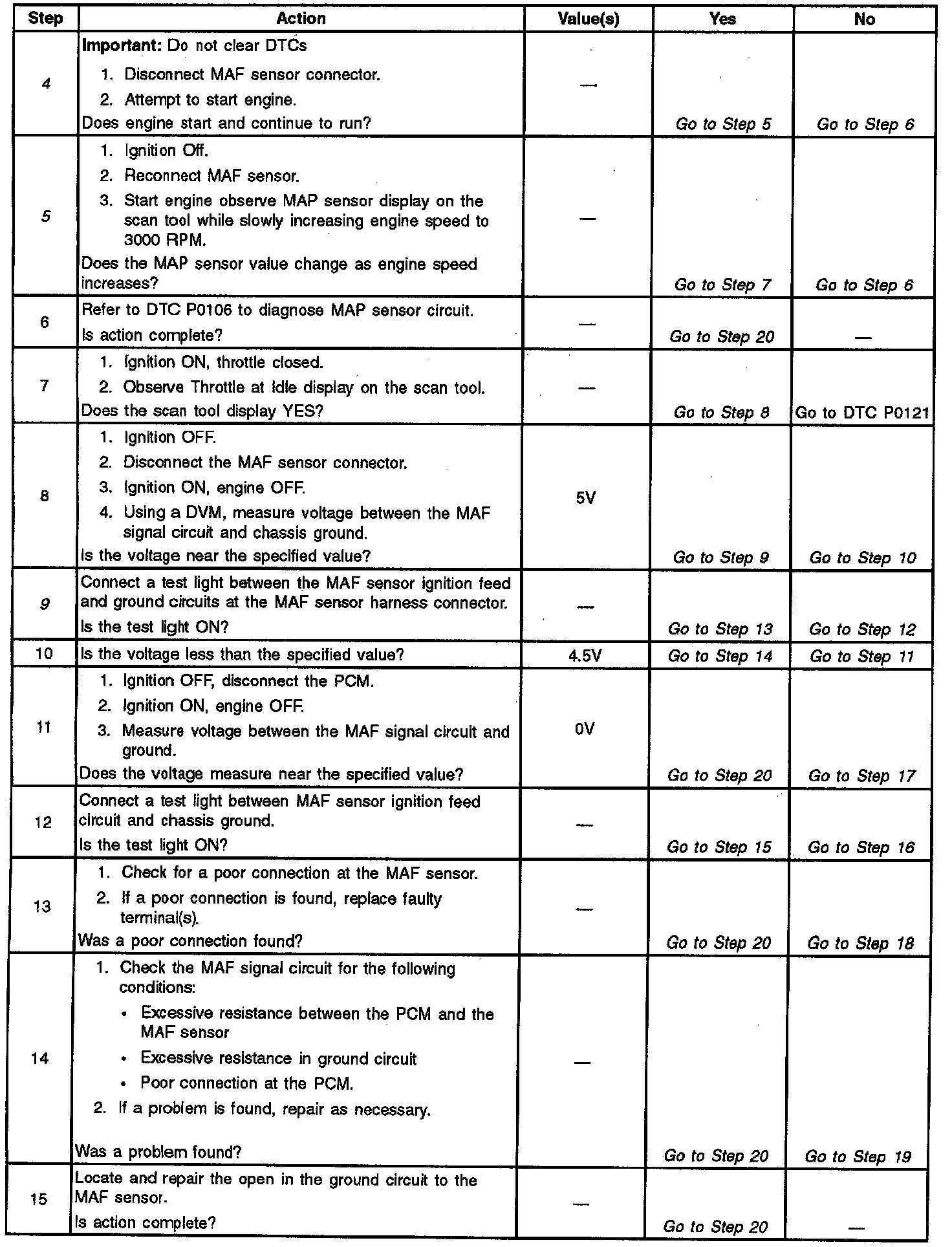 4. This step checks the MAP sensor. By disconnecting the MAF sensor, the vehicle is forced into speed density; Speed density is based on the MAP, TP, and engine RPM readings. With a skewed/unresponsive MAP sensor, the speed density calculation is incorrect and vehicle may not start. For further information refer to diagnostic aids.