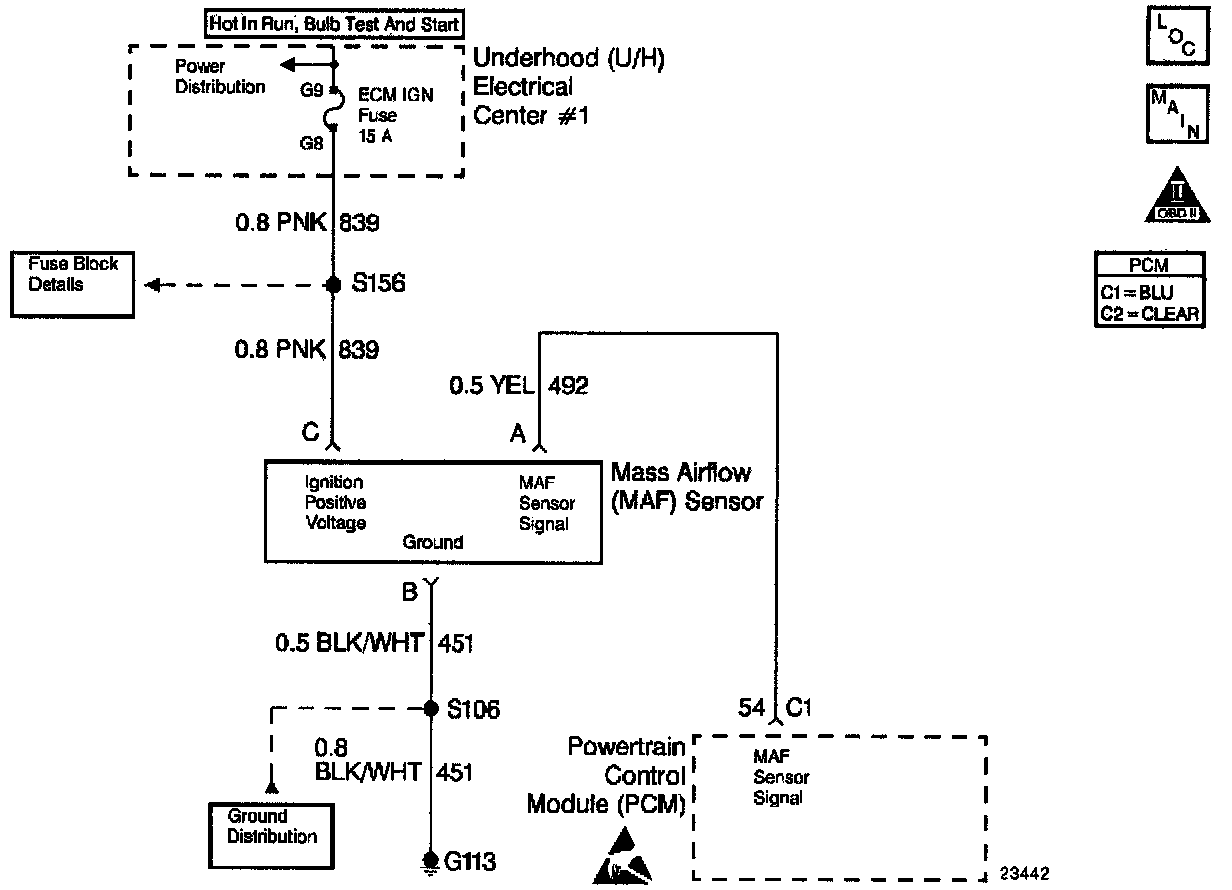 6. Verifies that ignition feed voltage and a good ground are available at the MAF sensor.