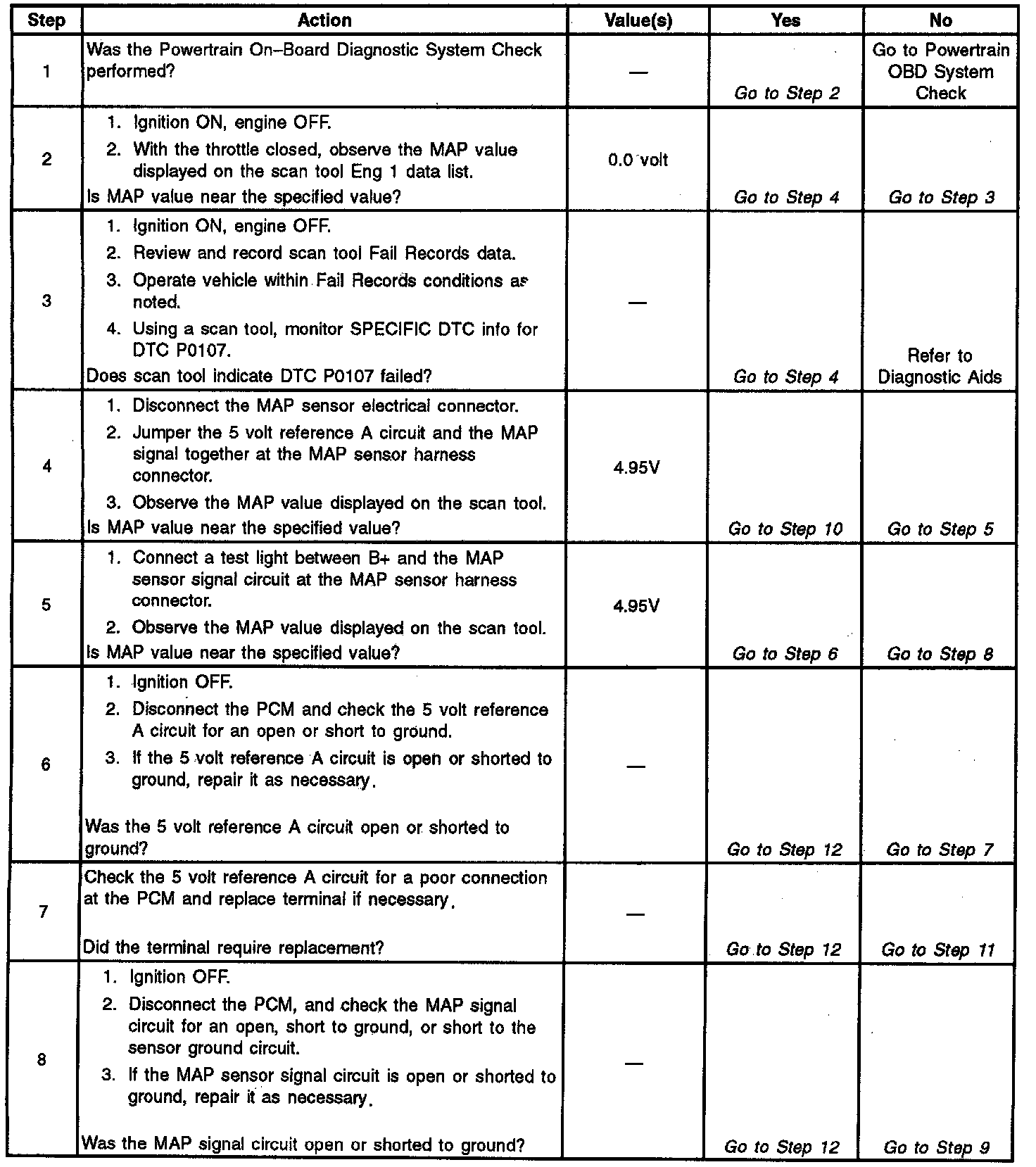 The PCM monitors the MAP signals for voltages outside the normal range of the MAP sensor. If the PCM detects a MAP signal voltage that is excessively low, DTC P0107 will be set.