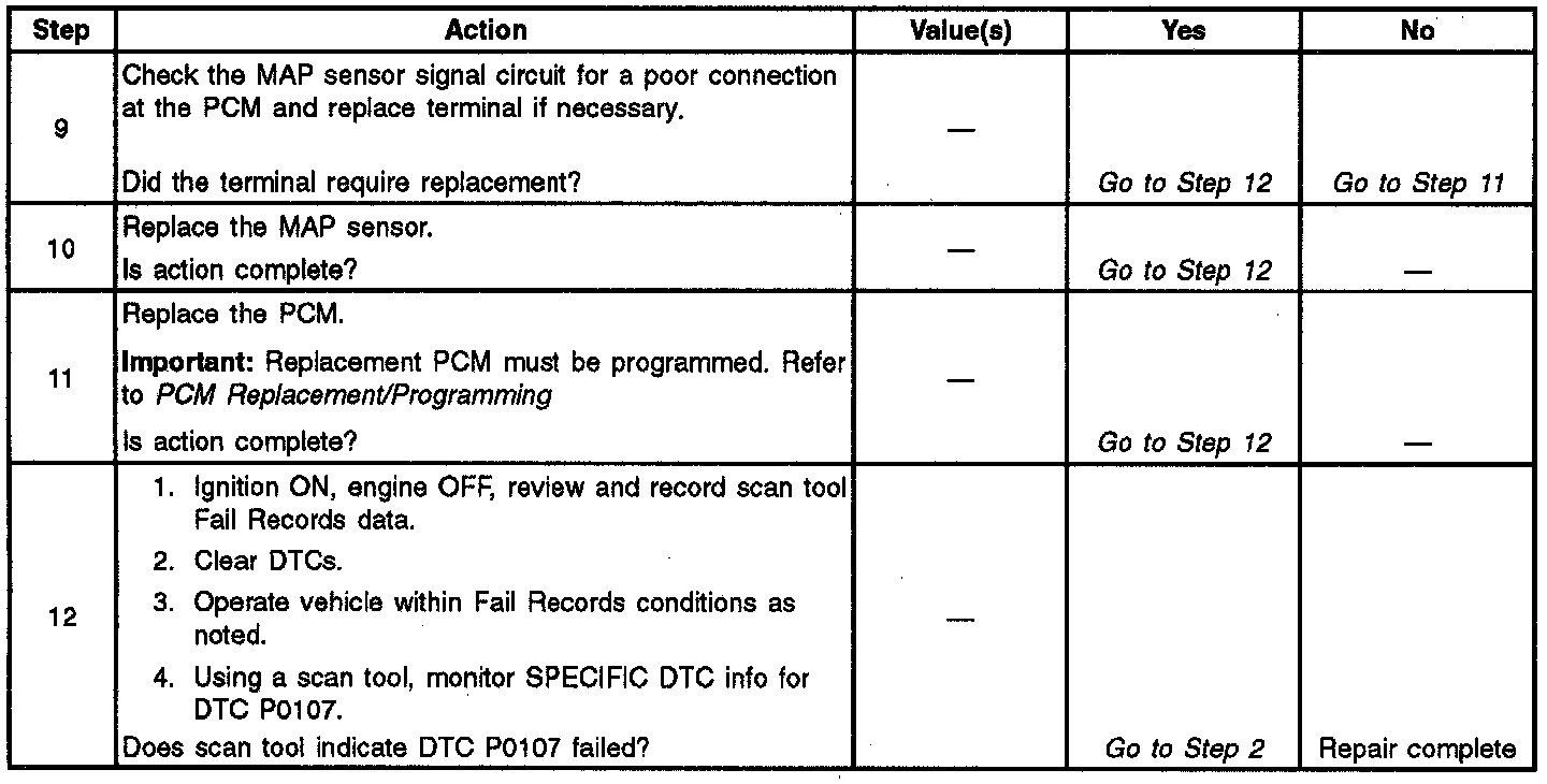 If DTC P0107 cannot be duplicated, the information included in the Fail Records data can be useful in determining since the DTC was last set. If it is determined that the DTC occurs intermittently, performing the DTC P1107 Diagnostic Chart may isolate the cause of the fault.