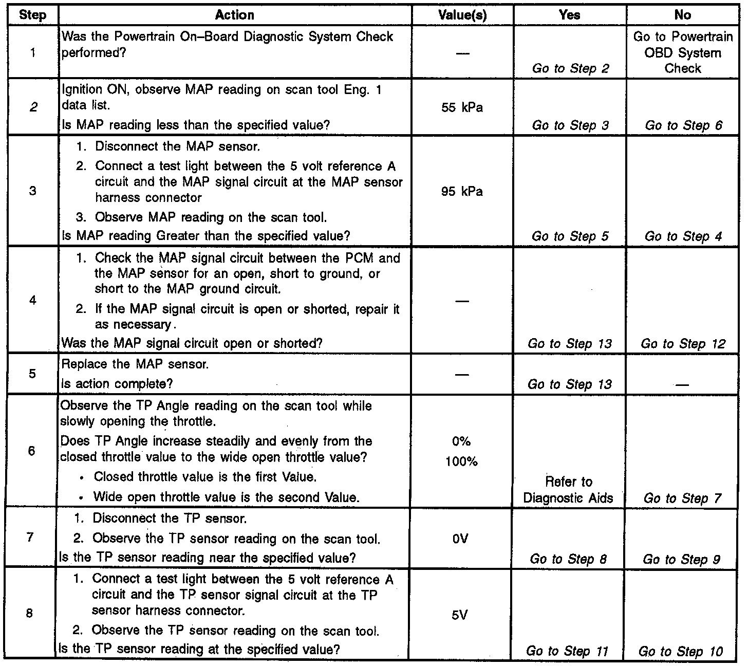 ^ Skewed MAP signal or faulty MAP sensor. An incorrect MAP signal may cause the PCM to incorrectly calculate the predicted TP sensor value during high engine load situations. Check for an unusually low MAP reading. This condition can cause DTC P0121 to be set.