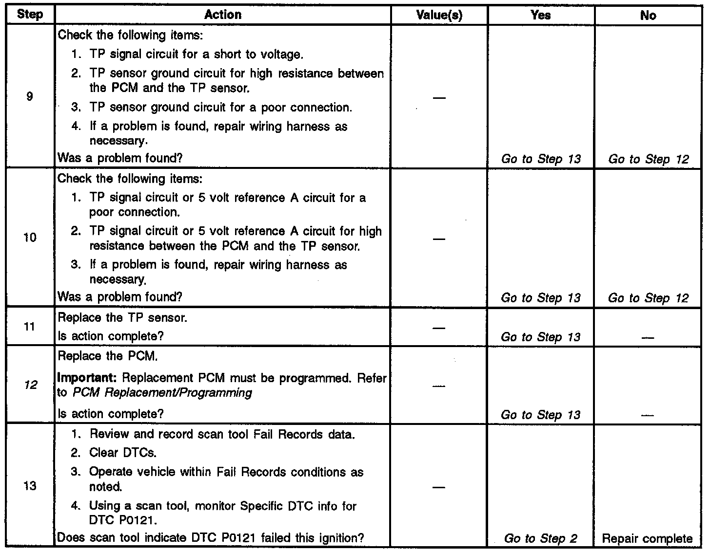If DTC P0121 cannot be duplicated, the information included in the Fail Records data can be useful in determining vehicle mileage since the DTC was last set. If it is determined that the DTC occurs intermittently, performing the DTC P1122 and DTC P1121 Diagnostic Charts may isolate the cause of the fault.