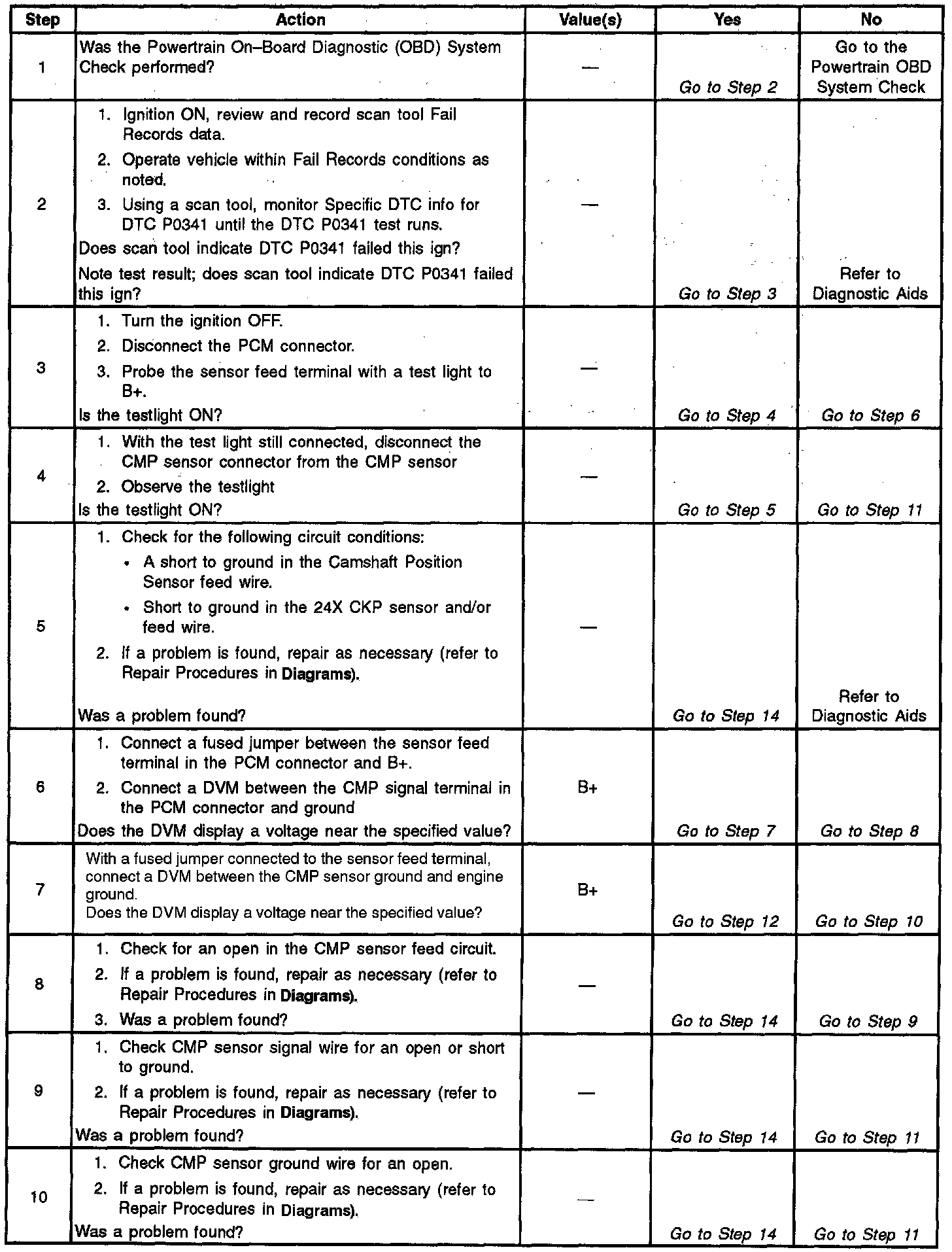 During cranking, the Ignition Control Module (ICM) monitors the 7X crankshaft position sensor signal. Once the ICM determines spark synchronization, 3X reference signals are sent to the Powertrain Control Module (PCM). The PCM will command all six injectors ON for one priming shot of fuel in all cylinders. After the priming, the injectors are left OFF for the next six fuel control reference signals (two crankshaft revolutions). This allow each cylinder a chance to use the fuel from the priming shot. During this waiting period, a cam pulse will have been received by the PCM. The PCM uses the Cam signal pulses to initiate sequential fuel injection. The PCM constantly monitors the number of pulses on the Cam signal circuit and compares the number of Cam pulses to the number of 24X reference pulses and the number of 3X reference pulses being received. If the PCM receives an incorrect number of pulses-on the Cam reference circuit, DTC P0341 will set and the PCM will initiate injector sequence without the Cam signal with a one in six chance that injector sequence is correct. The engine will continue to start and run normally, although the misfire diagnostic will be affected if a misfiring condition occurs.