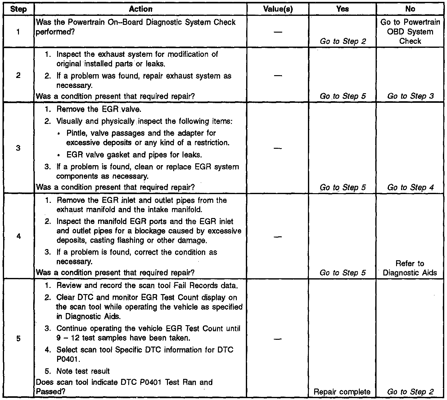 The Powertrain Control Module (PCM) tests the Exhaust Gas Recirculation (EGR) system during deceleration by momentarily commanding the EGR valve to open while monitoring the Manifold Absolute Pressure (MAP) sensor signal. When the EGR valve is opened, the PCM should see a proportional increase in MAP. If the expected increase in MAP is not seen, the PCM notes the amount of error that was detected and adjusts an internal fail counter towards a fail threshold level. When the fail counter exceeds the fail threshold level, the PCM will set DTC P0401. The number of test samples required to accomplish this may vary according to the amount of detected flow error.