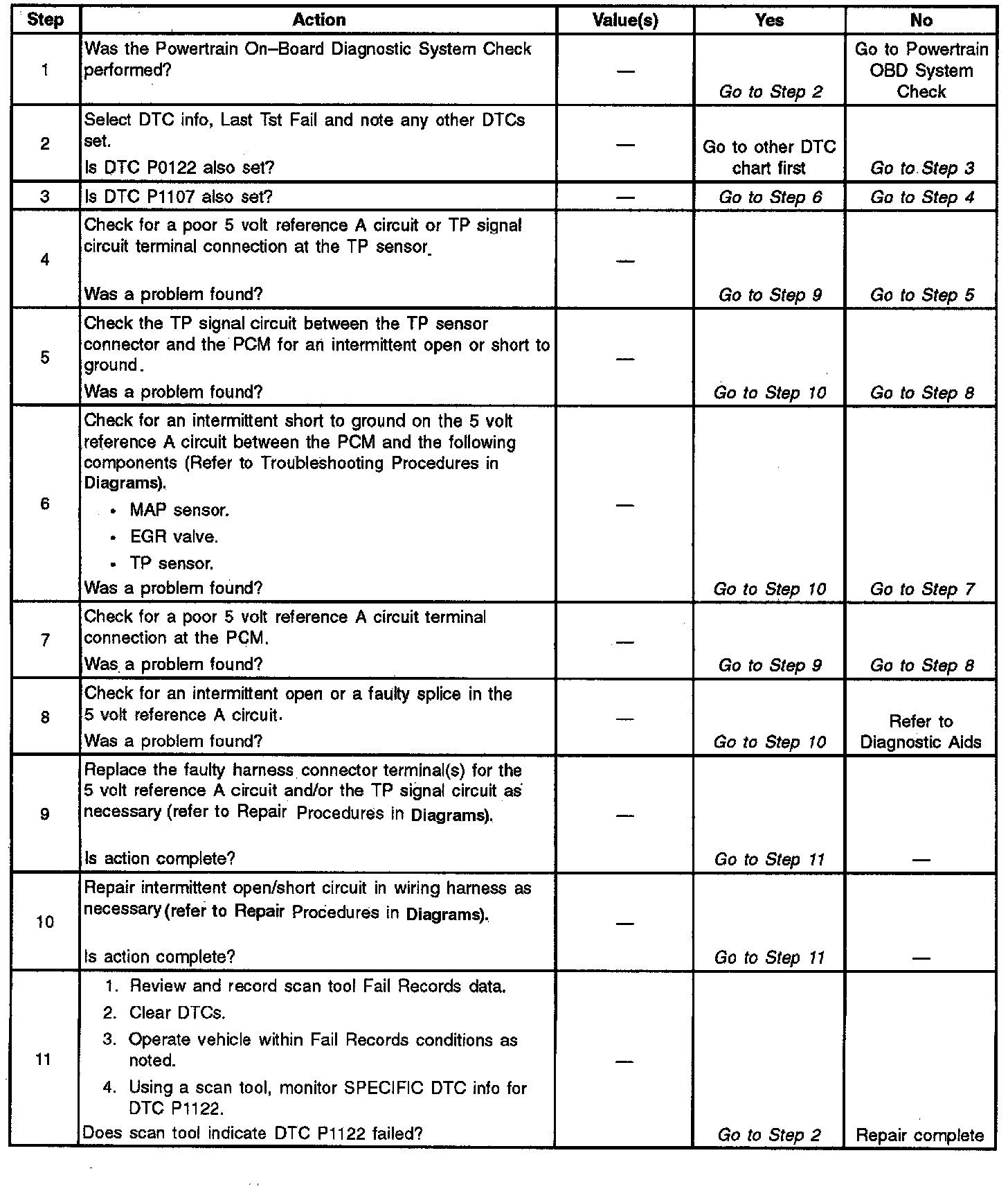 The TP signal is one of the most important inputs used by the Powertrain Control Module (PCM) for fuel control and most of the PCM controlled outputs. If the PCM detects a TP signal that is intermittently below the range of the TP sensor, DTC P1122 will be set.