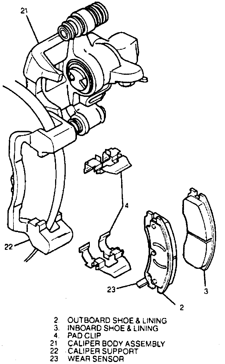 10. Install pad clips and outboard and inboard shoe and linings in caliper support. Ensure wear sensor is on outboard shoe positioned downward at leading edge of rotor during forward wheel rotation.