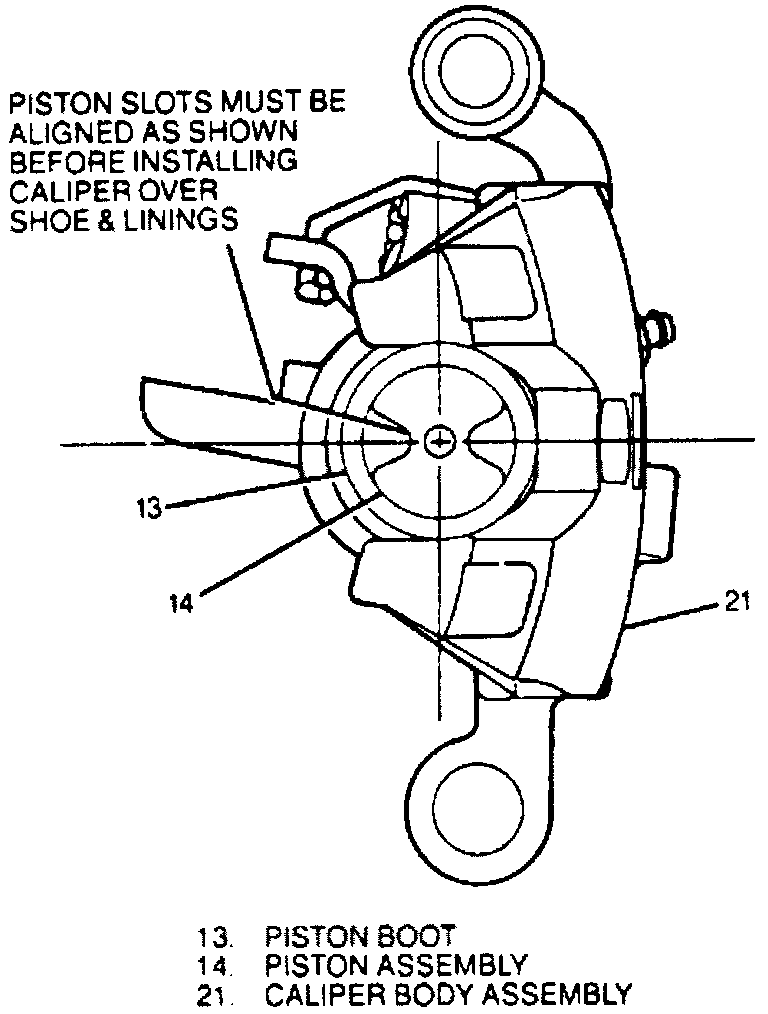 11. Pivot caliper body assembly down over shoe and lining assemblies being careful not to damage piston boot on inboard shoe.
