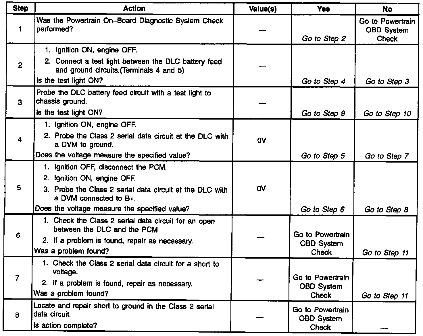 The Class 2 serial data circuit to the Data Link Connector (DLC) allows bi-directional communication between the Powertrain Control Module (PCM) and the scan tool. If communication between the scan tool and the PCM cannot be established, the procedure in Data Link Connector Diagnosis should be used to diagnose the condition.