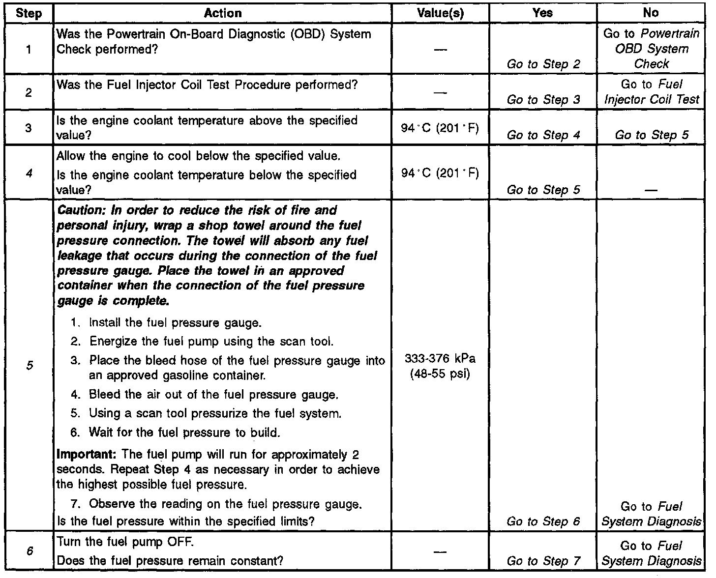 6. The fuel pressure should reach a steady value. If the fuel pressure does not reach a steady value, go to Fuel System Diagnosis.