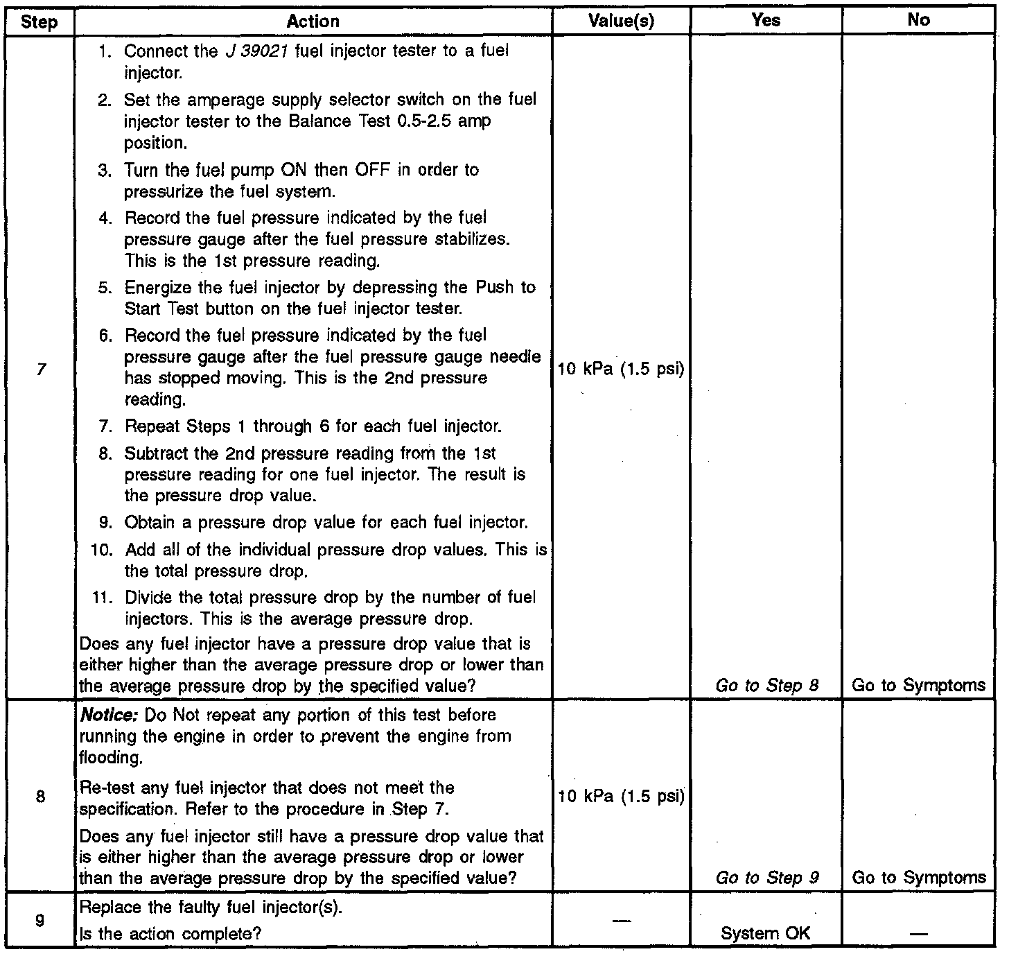 7. If the pressure drop value for each fuel injector is within 10 kPa (1.5 psi) of the average pressure drop value, the fuel injectors are flowing properly. Calculate the pressure drop value for each fuel injector by subtracting the second pressure reading from the first pressure reading. Refer to the Injector Balance Test Example.