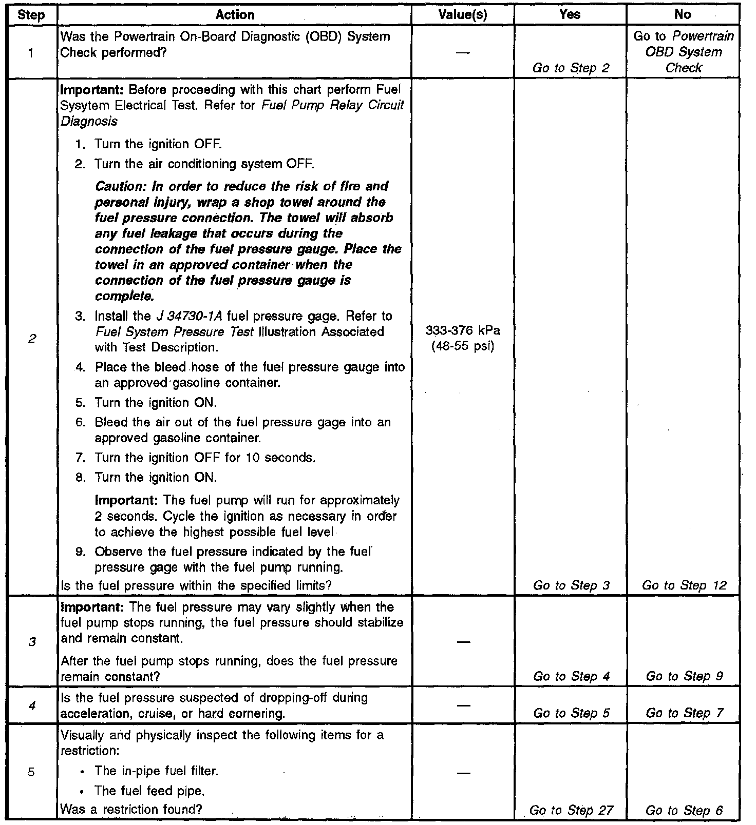 16. A lean condition may result from the fuel pressure being below 333 kPa (48 psi). A lean condition may cause a DTC P0131 or a DTC P0171 to set. Driveability conditions associated with lean conditions can include hard starting (when the engine is cold), hesitation, poor driveability, lack of power, surging, and misfiring.